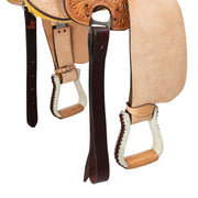 Sella western da lavoro realizzata in pelle rovesciata di alta qualità, seggio profondo, arcione in Ralide e fibbie in acciaio inox che gli conferiscono stabilità, sicurezza e resistenza nel tempo.