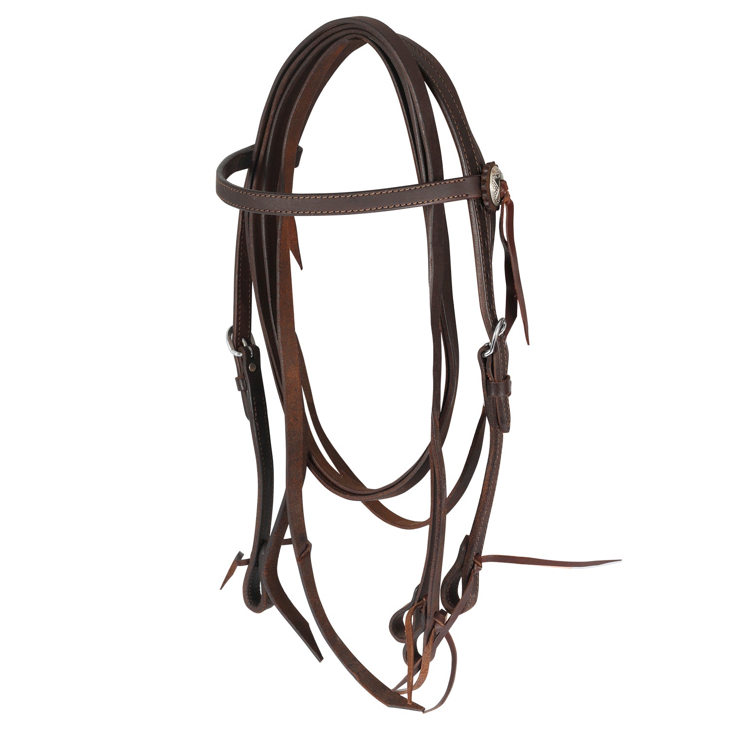 Testiera western realizzata in cuoio ingrassato, con frontalino dritto e fibbie in acciaio inox che conferiscono sicurezza, stabilità e resistenza nel tempo.