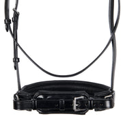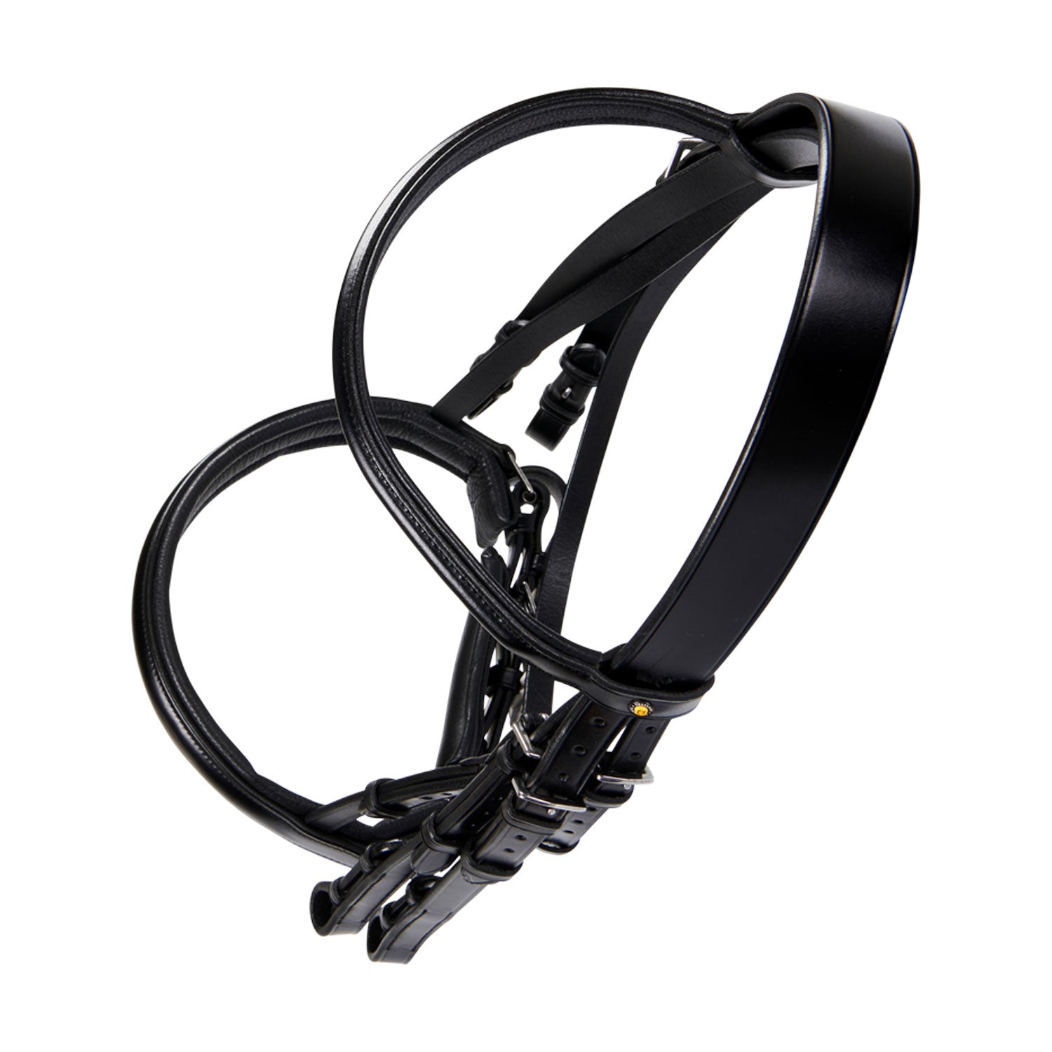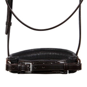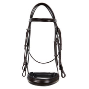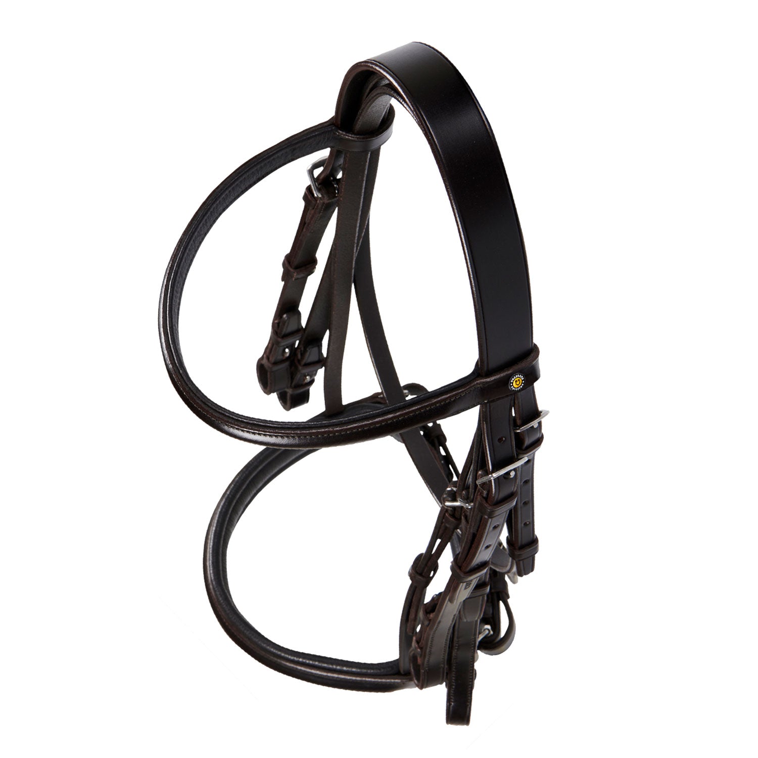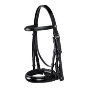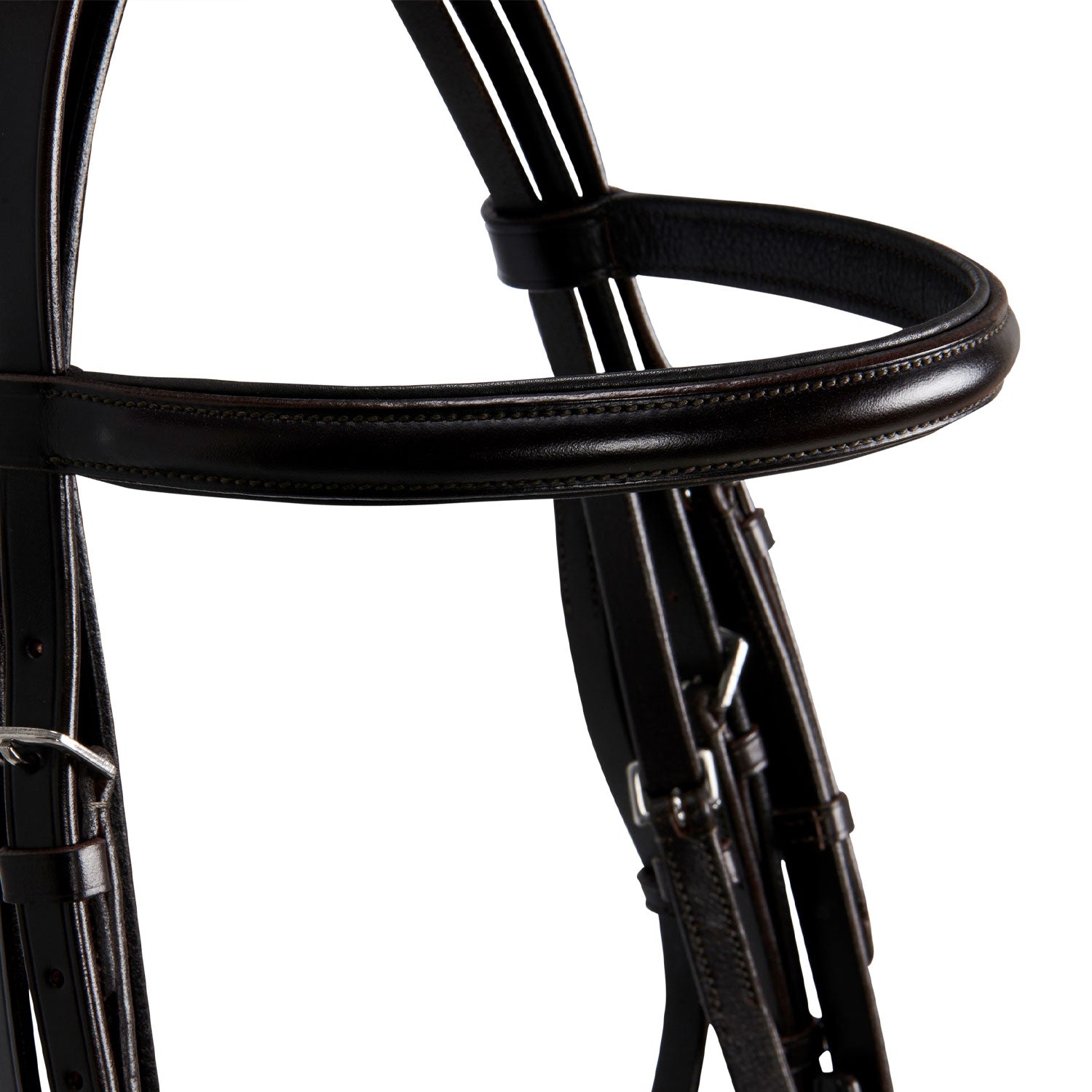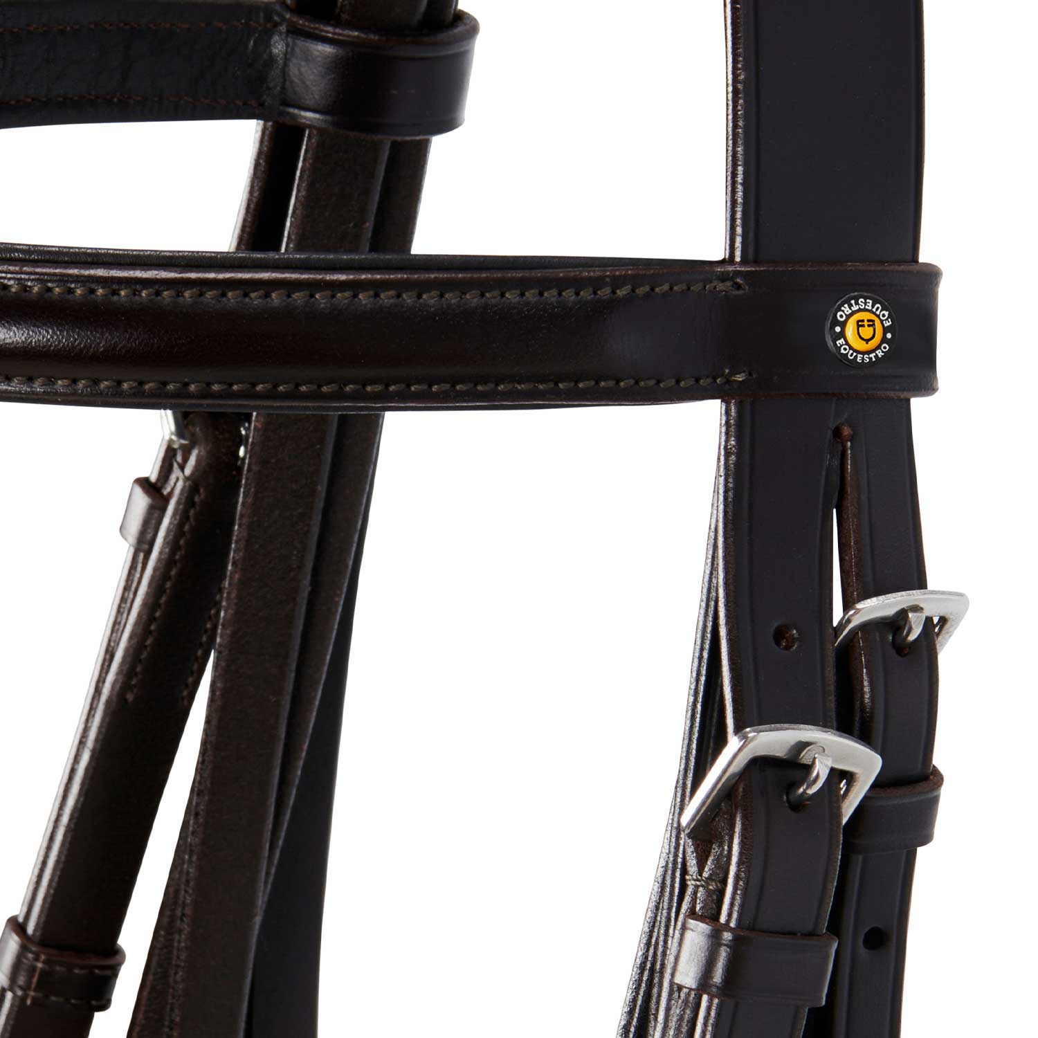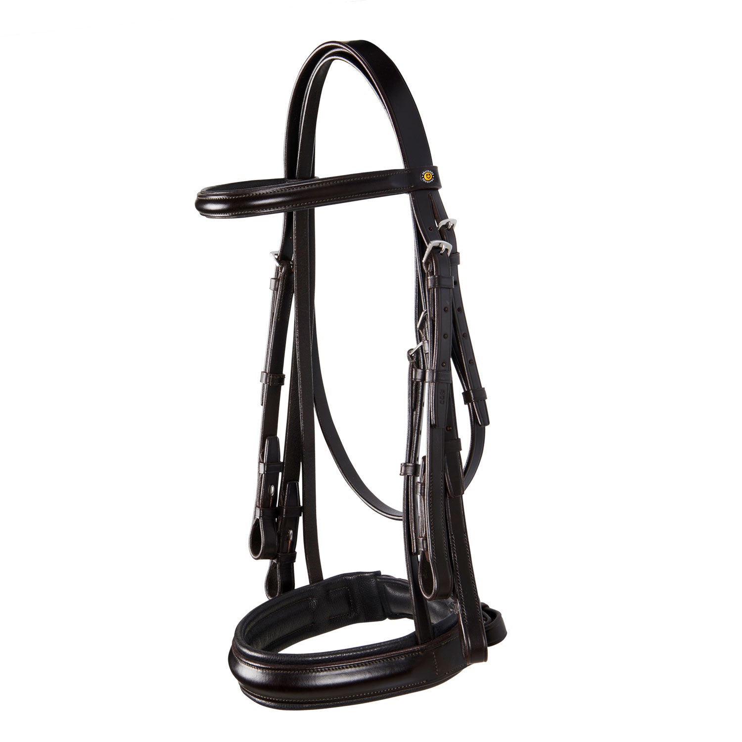 Briglia da dressage in morbido cuoio italiano, con fibbie in acciaio inox che gli conferiscono resistenza e stabilità per tutta la durata di utilizzo.
