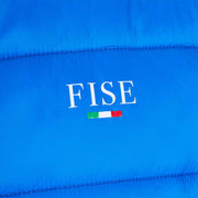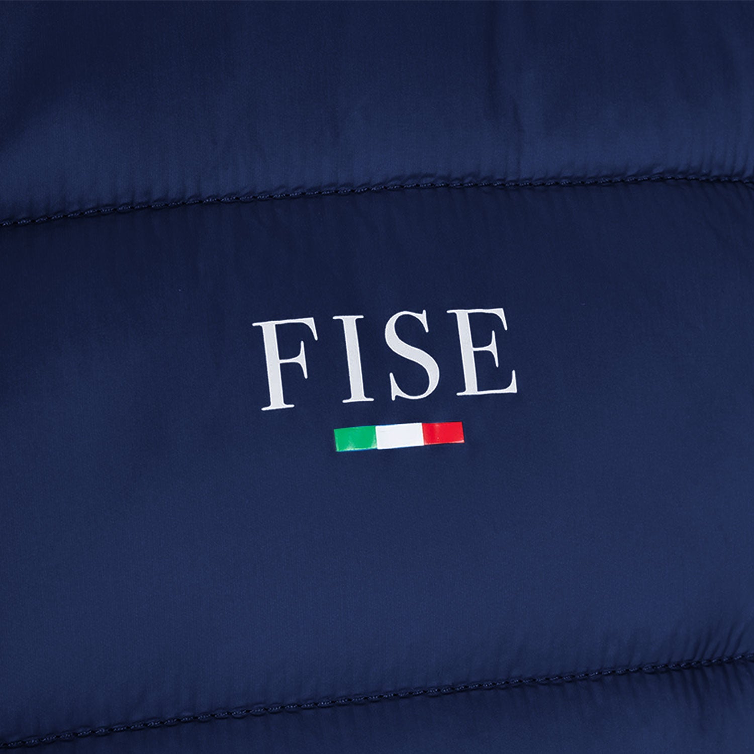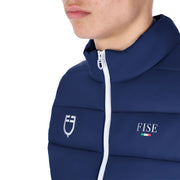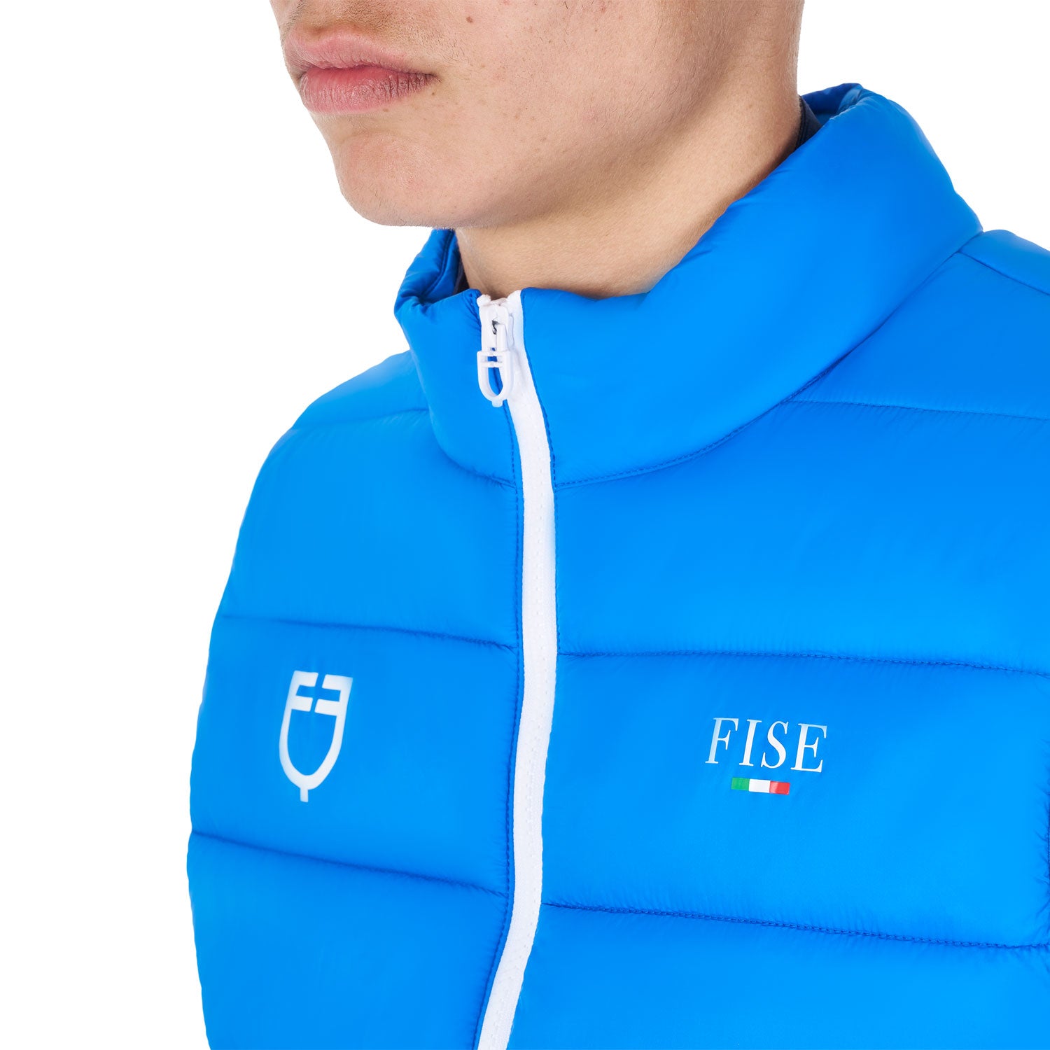 Si presenta con una leggera imbottitura, in modo tale da poter essere utilizzato anche a basse temperature. Il capo è impreziosito da una chiusura a zip con sistema antivento e due tasche laterali oltre che con cordini tricolore lungo i fianchi e logo Equestro X FISE sul petto.