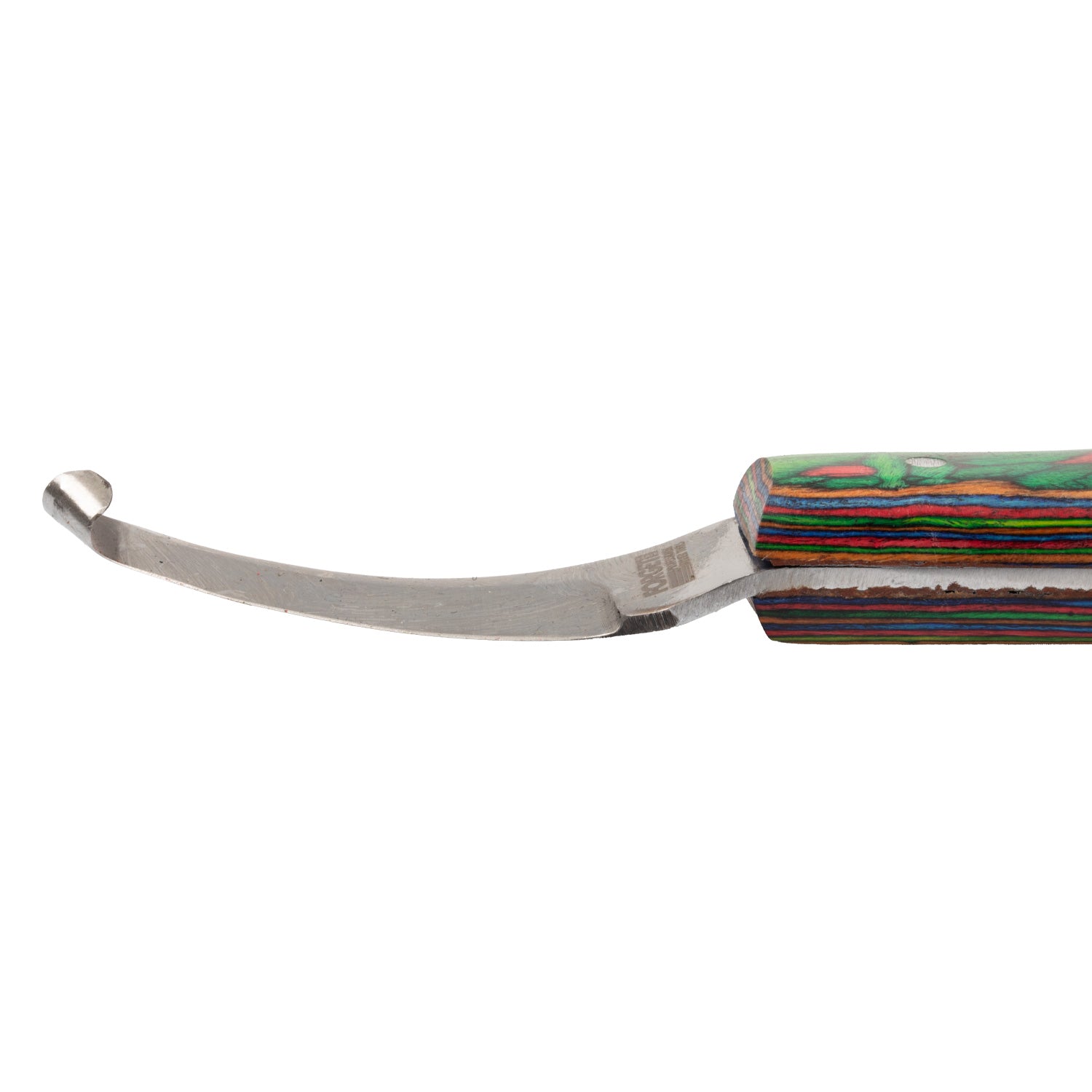 Coltello per rifinire le unghie, curvo per agevolare il lavoro e con manico in legno lavorato decorato con multicolor.
