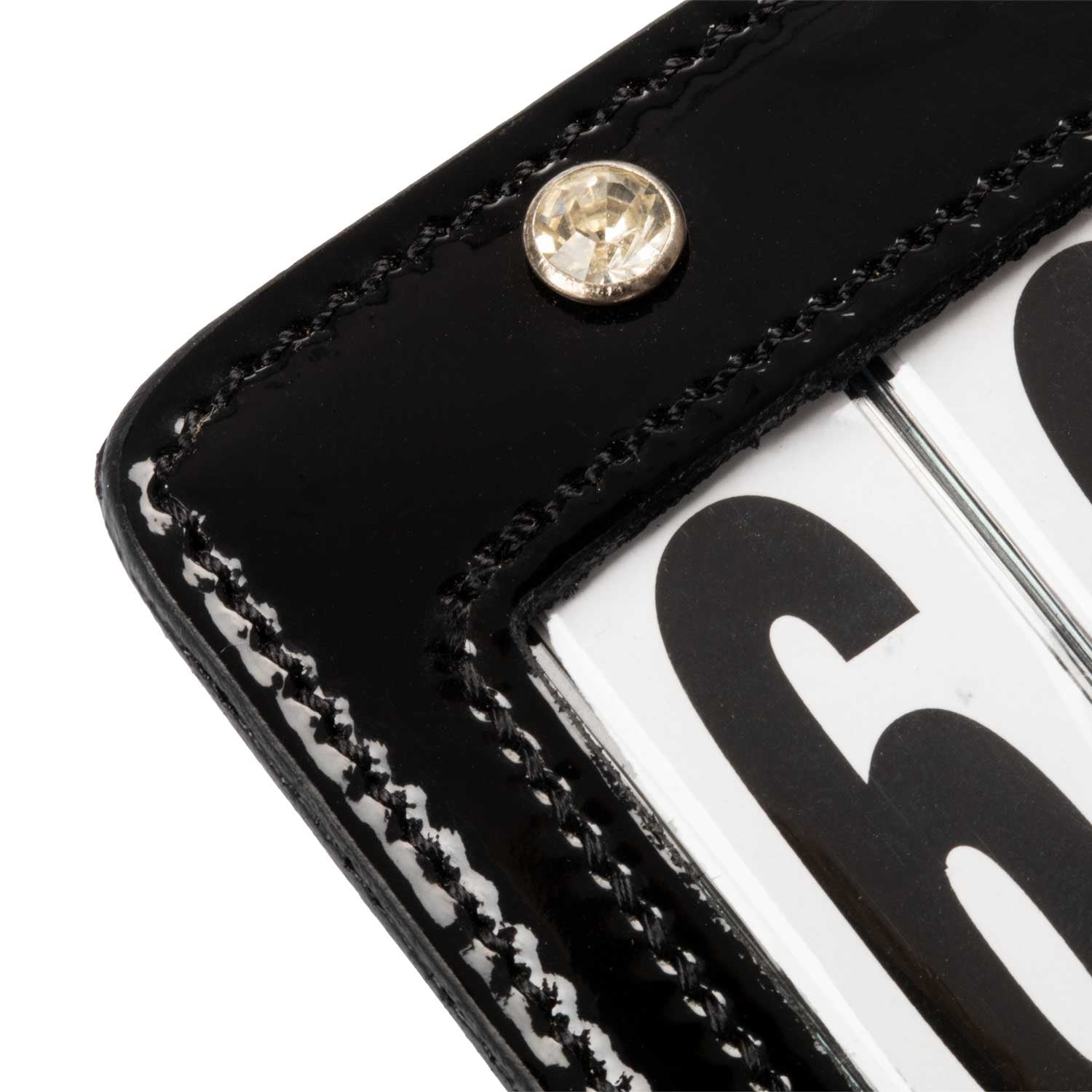 Porta numeri da gara realizzato in cuoio lucido di alta qualità e plastica trasparente, decorato con raffinati cristalli incastonati. Pensato per portare numeri fino a quattro cifre.