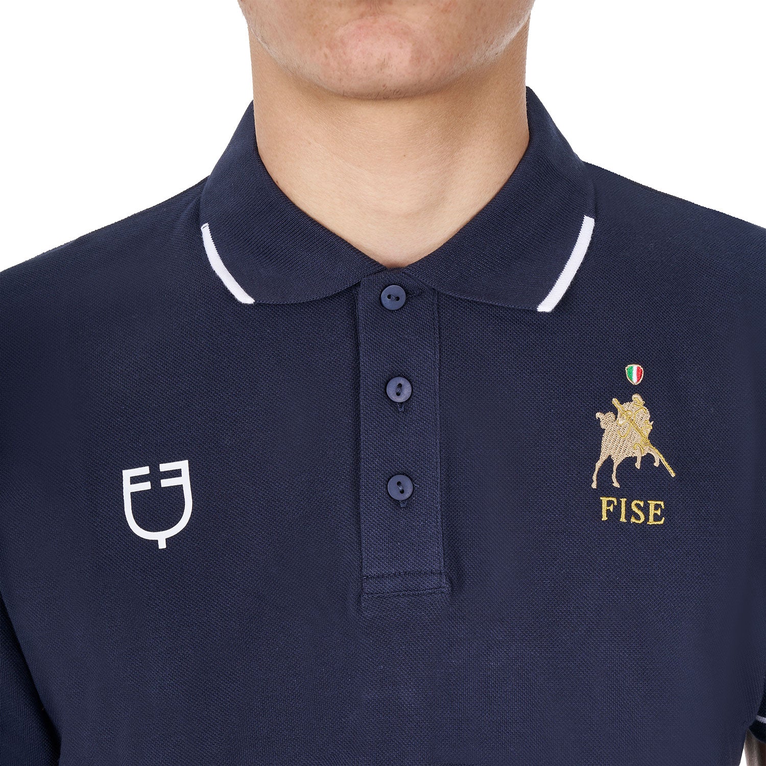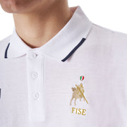 La polo è rifinita dal bordo a contrasto sia sulle maniche che sul colletto e la chiusura a tre bottoni ed è decorata con logo Equestro X FISE sul petto.