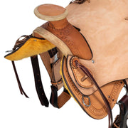 Sella western da lavoro realizzata in pelle rovesciata di alta qualità. Dotata di seggio profondo, arcione in Ralide e lavorazione waffle border stamp.