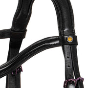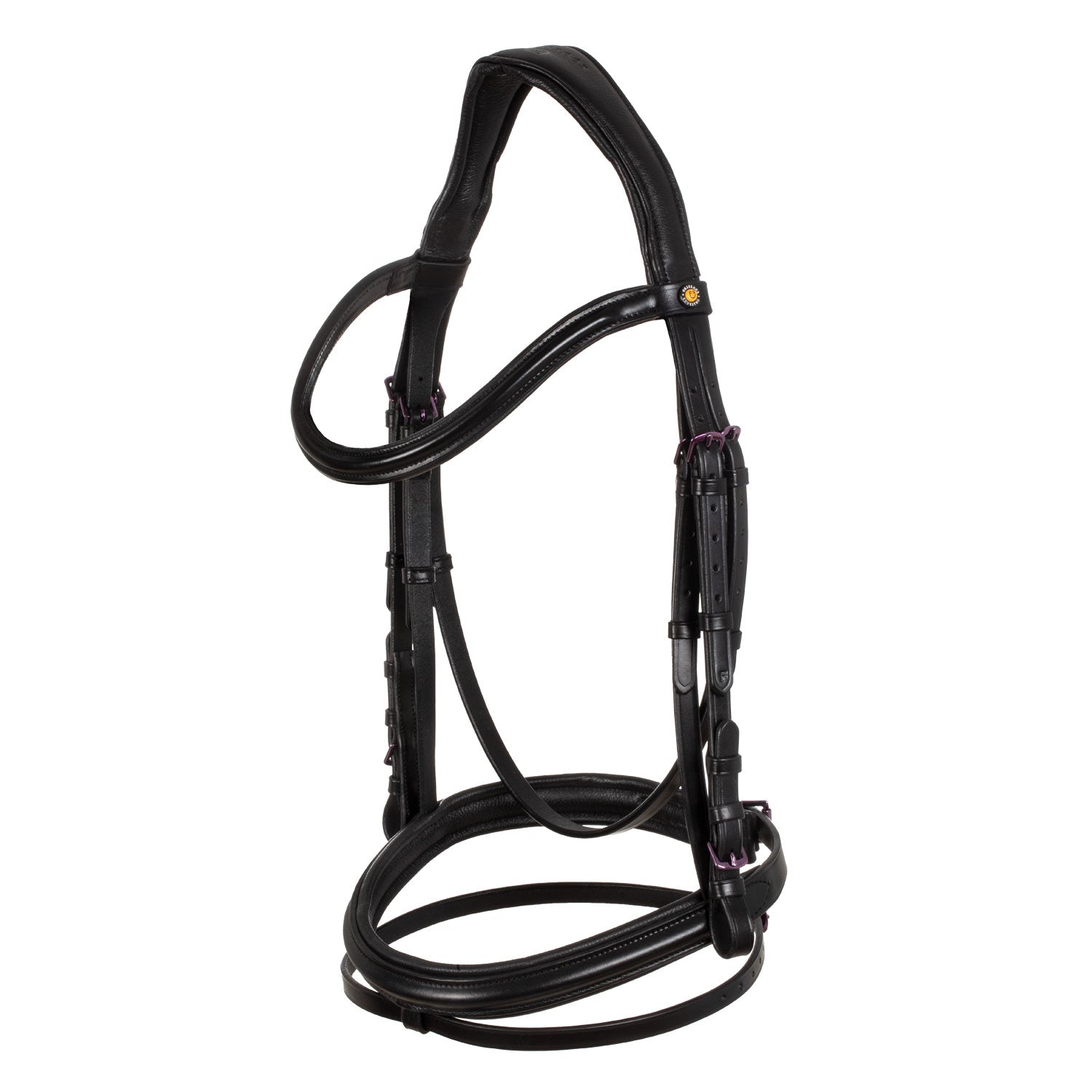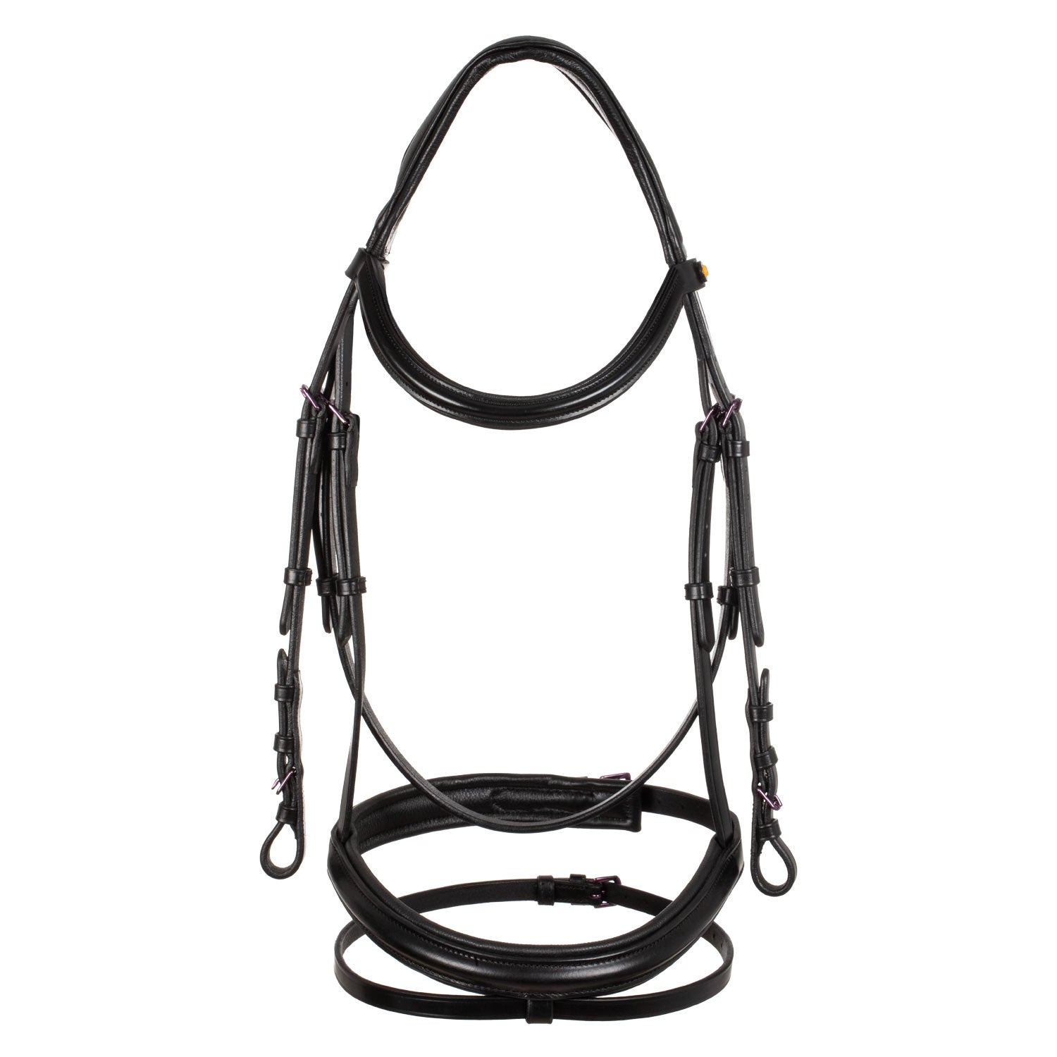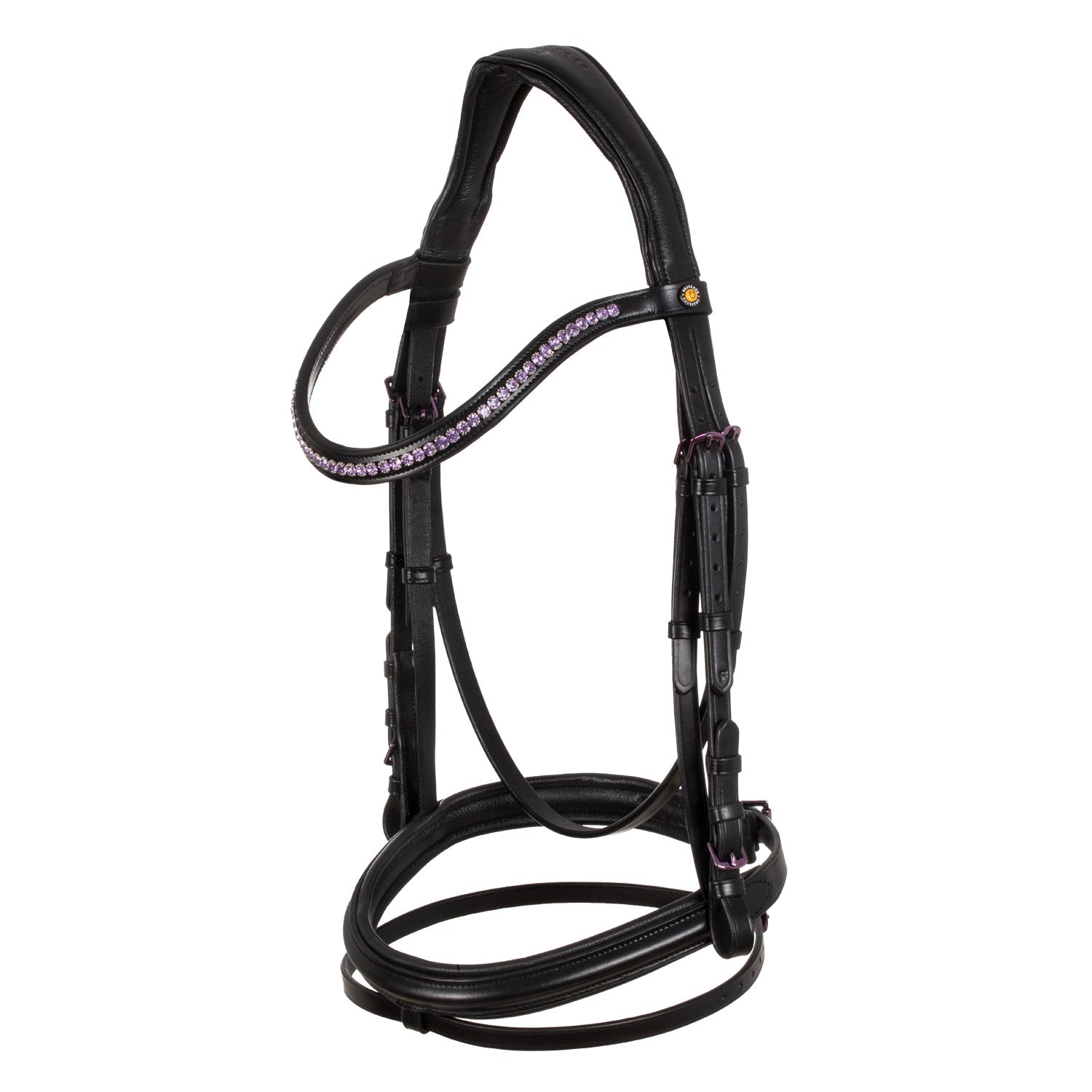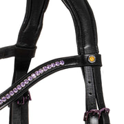Frontalino imbottito e decorato con fascia di strass viola e con placchetta gialla con logo Equestro.