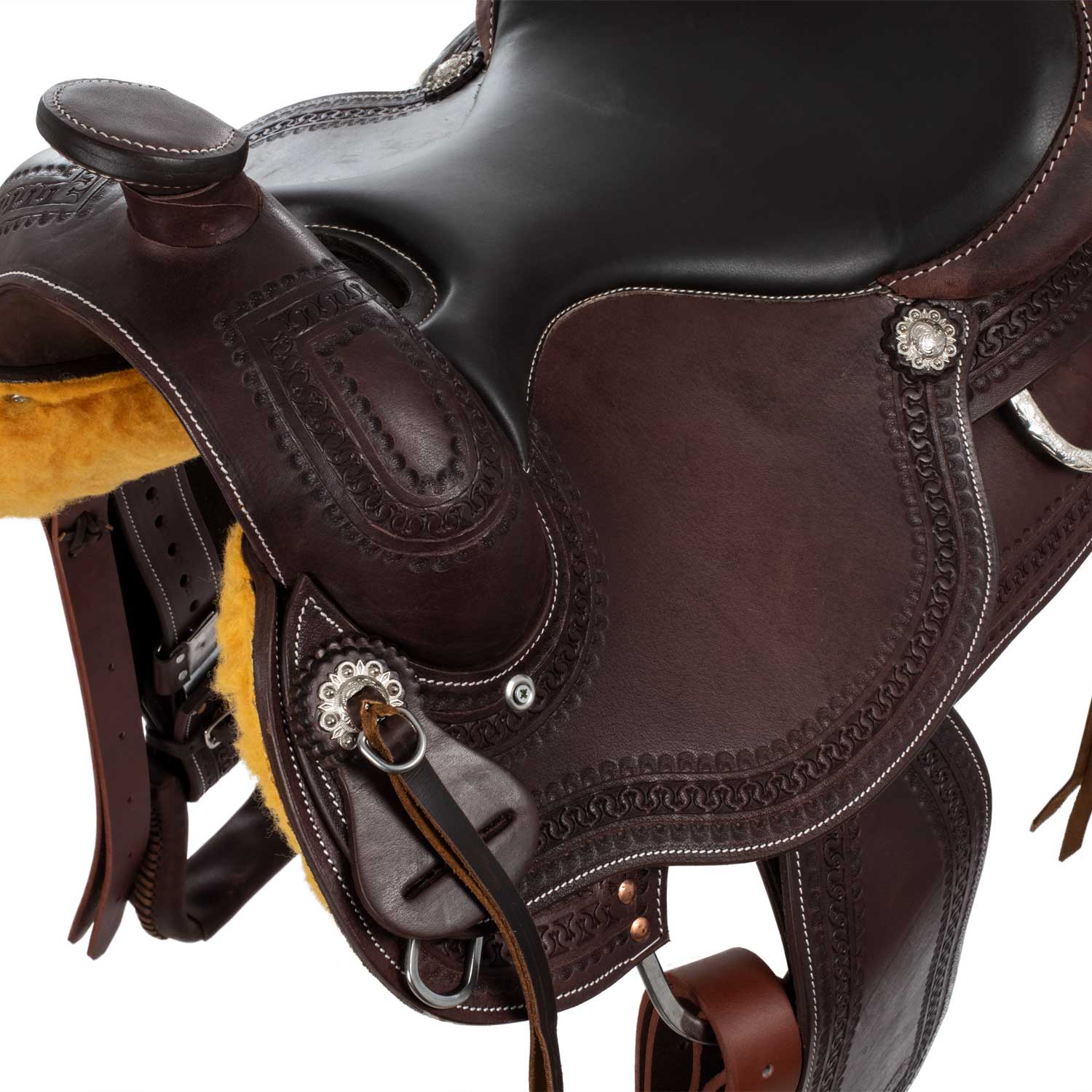 Sella Western realizzata in pelle pieno fiore di alta qualità, con arcione in Fibre Glass, Fork in legno e tutti i fissaggi in acciaio inossidabile.